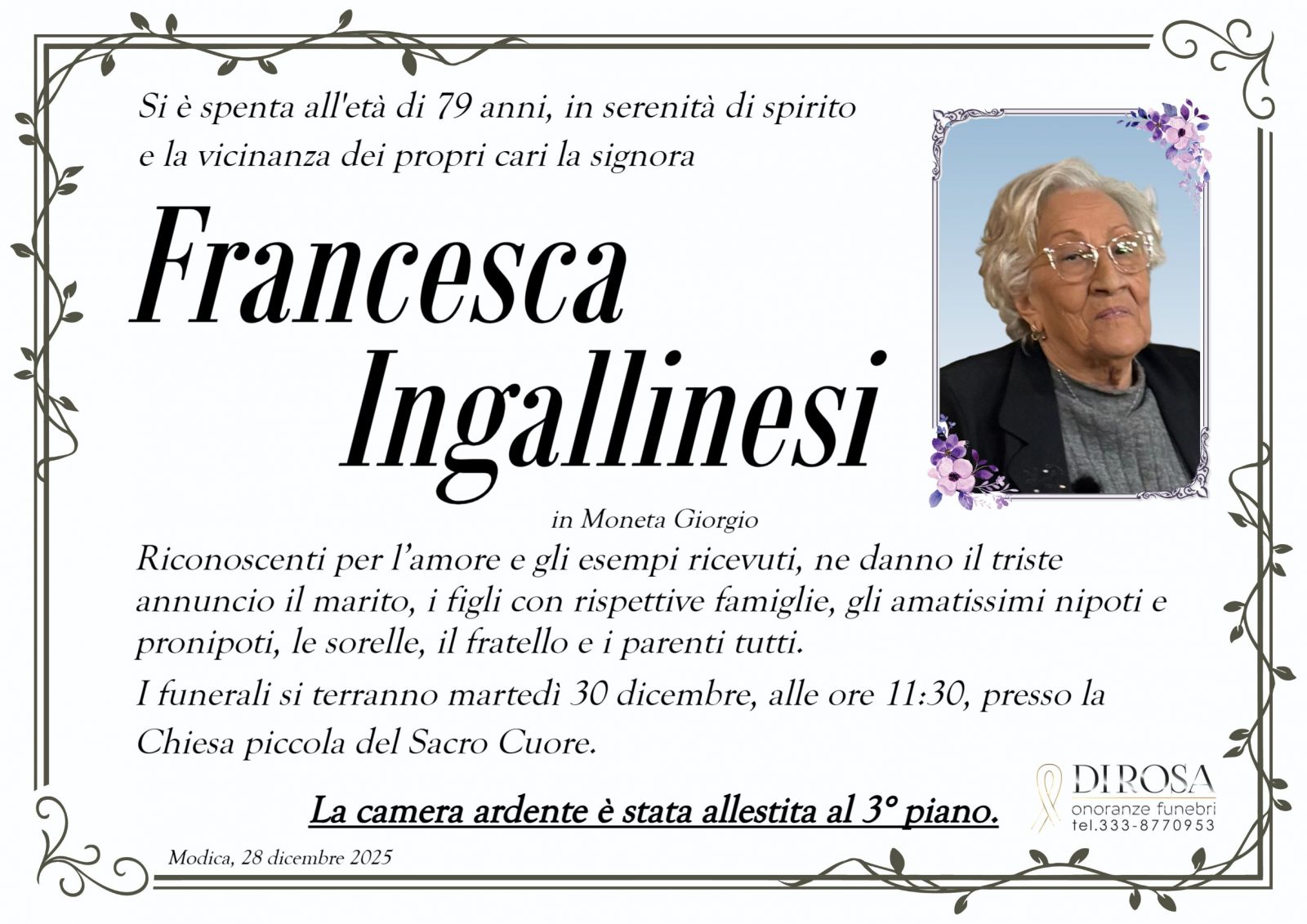 Lascia gratuitamente un messaggio di cordoglio, sarà nostra cura consegnarlo ai congiunti di Francesca Ingallinesi.