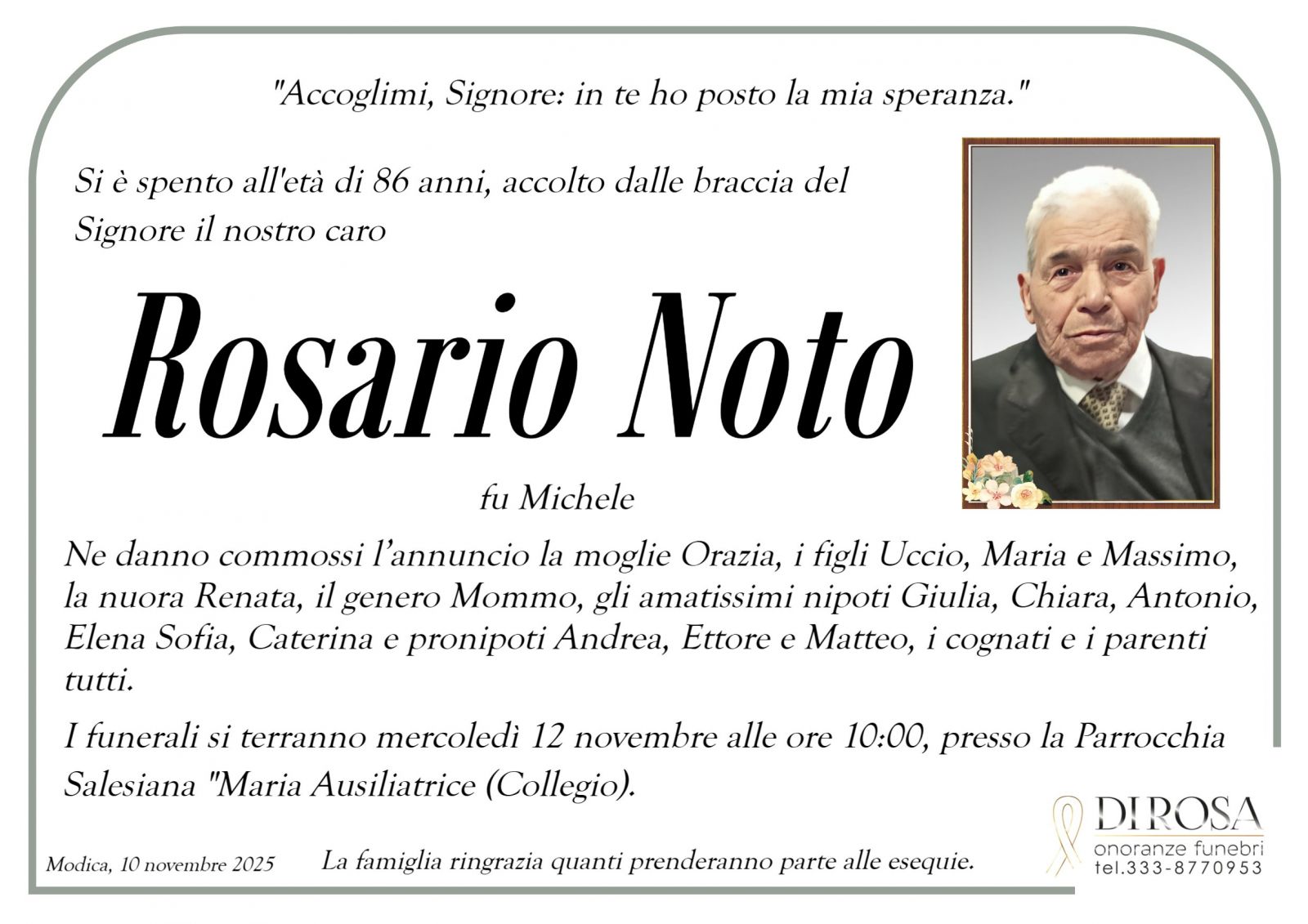 Lascia gratuitamente un messaggio di cordoglio, sarà nostra cura consegnarlo ai congiunti di Rosario Noto.